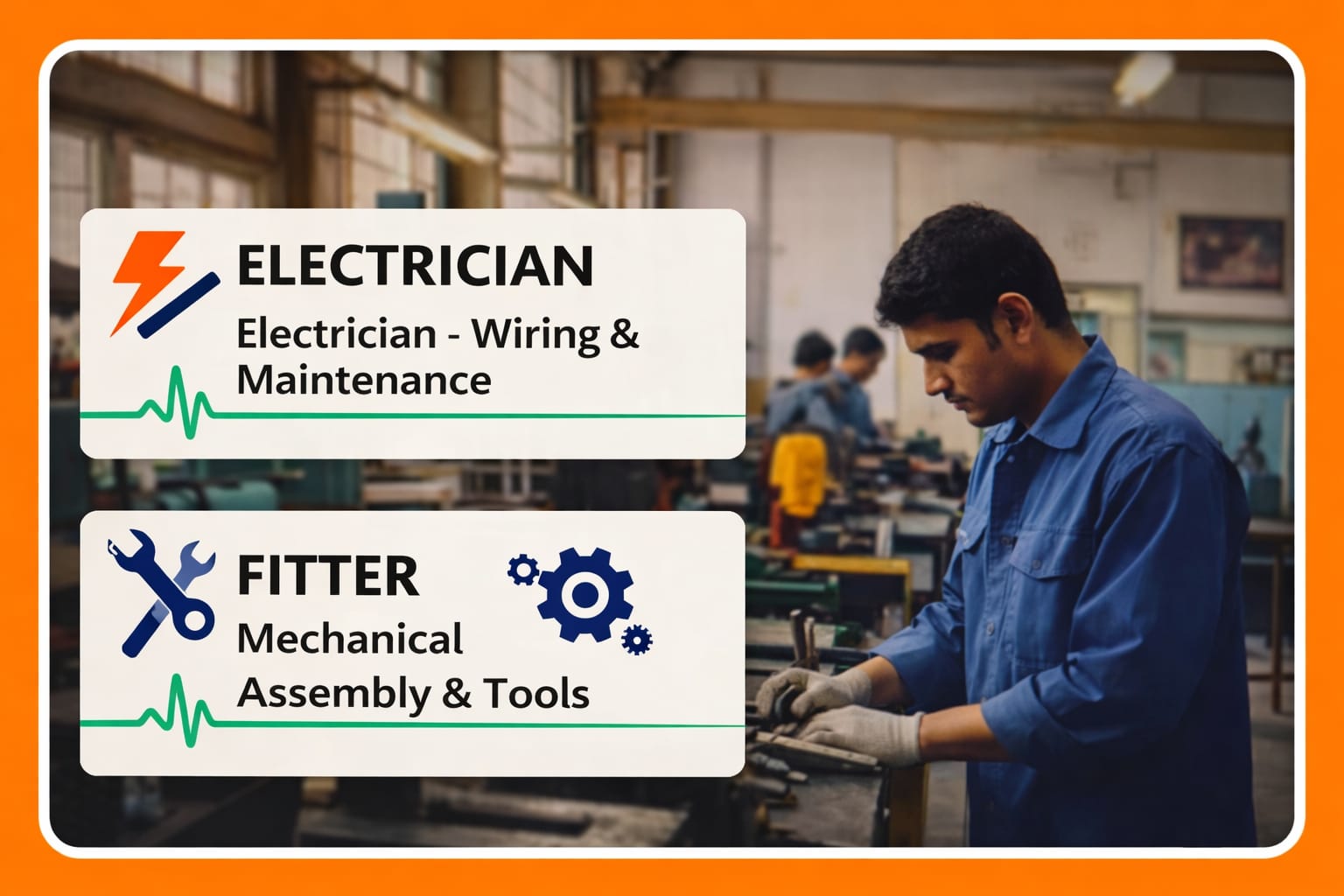 To develop skilled, confident and industry-ready students in the fields of **Electrician** and **Fitter**, empowering them with technical knowledge, discipline and real-world abilities for a successful future.